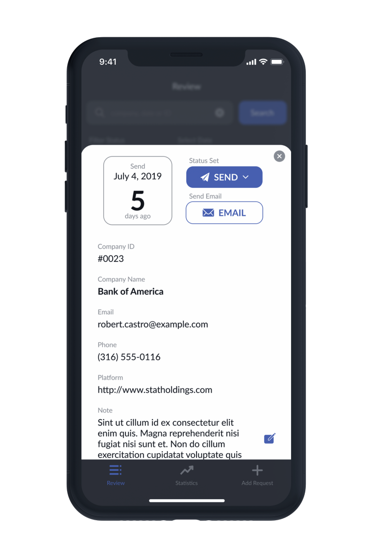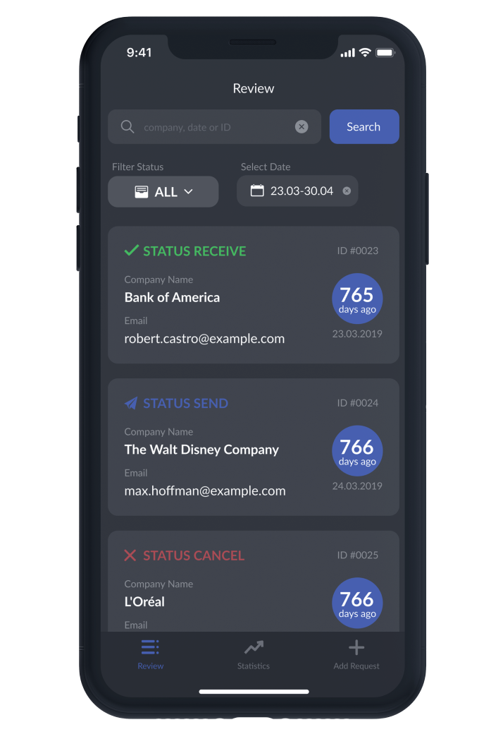 Use the search panel to find for the company that you need, the calendar to set the date for sending or searching for companies by ID or email.